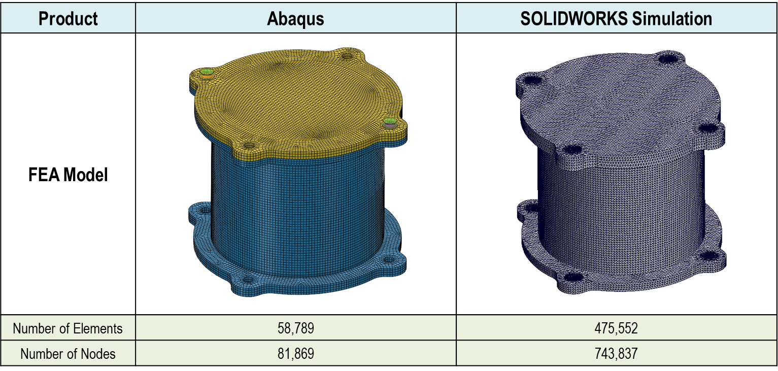 FEA 모델은 아래와 같으며 Abaqus에서는 육면체 요소를 사용하며 SW Simulation에서는 지원되어 있는 사면체 요소를 사용합니다.
