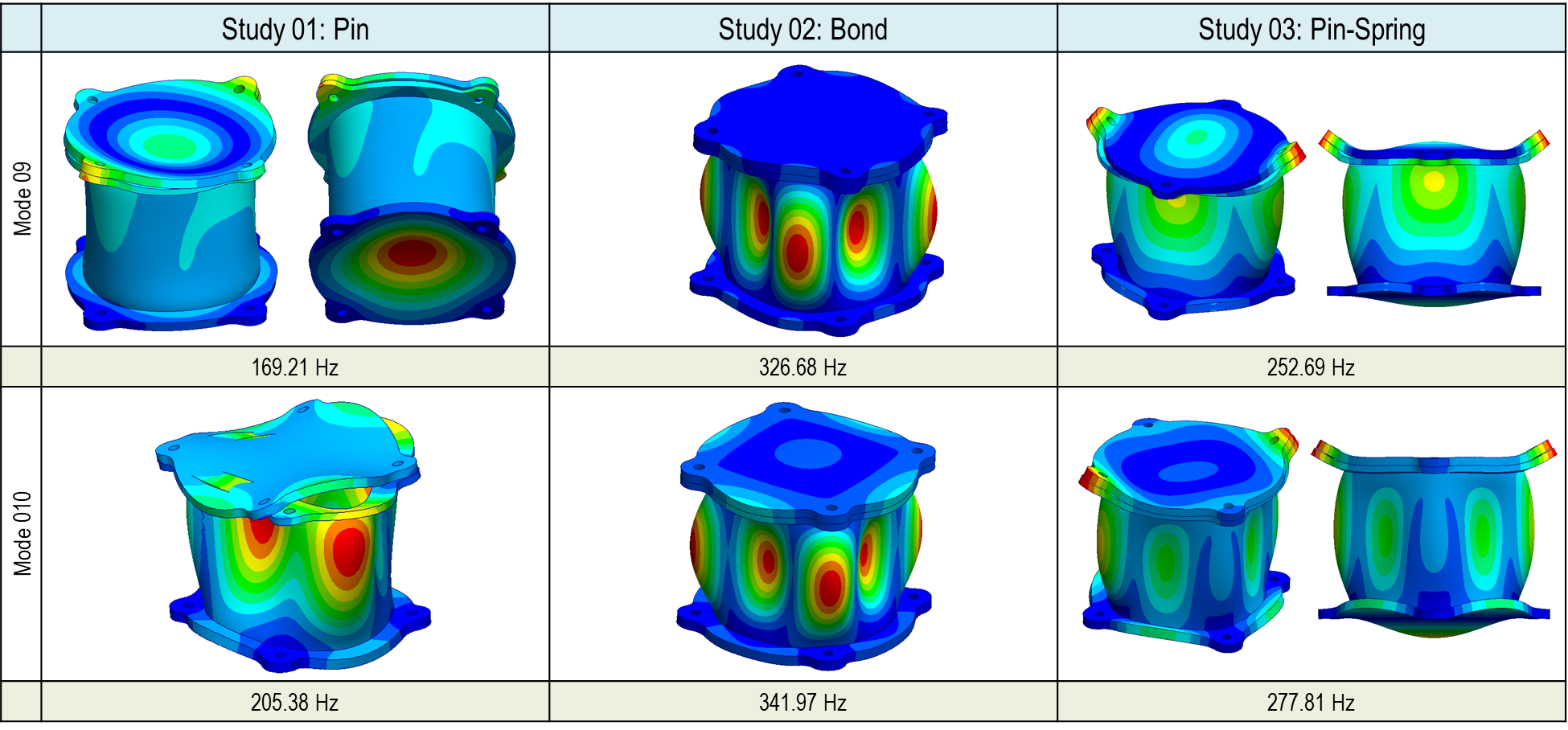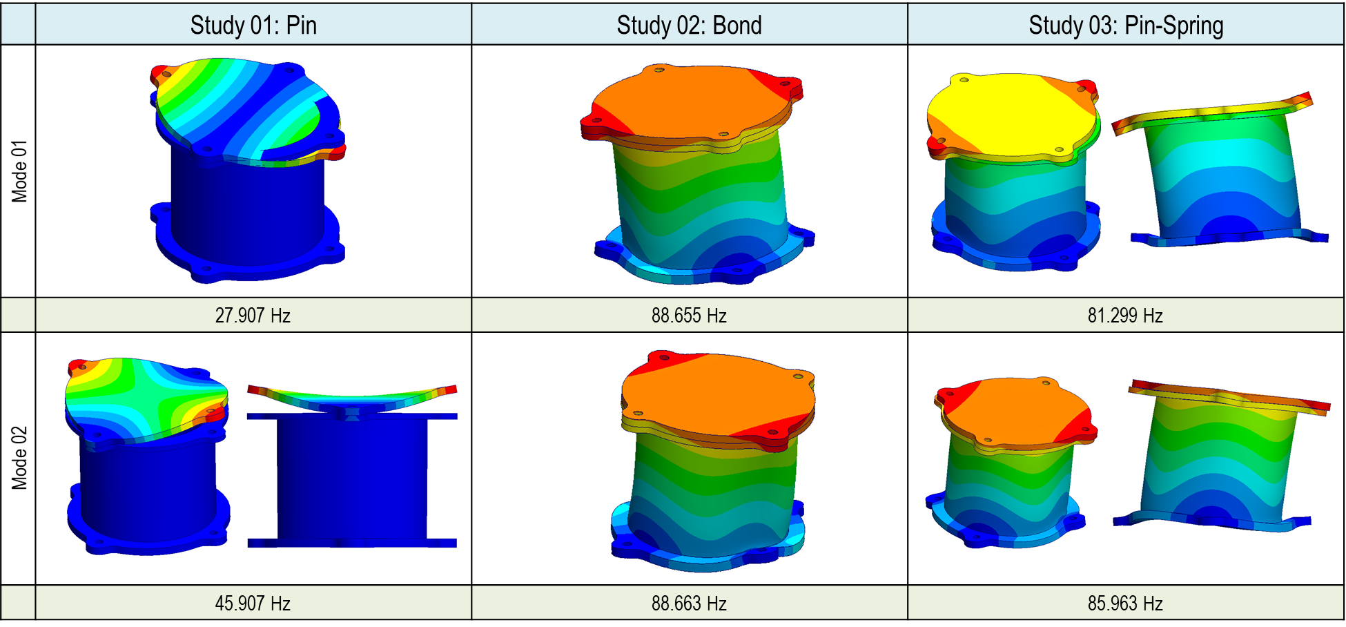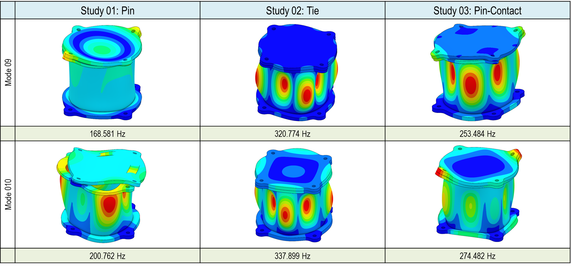 Bolt/Pin 커넥터를 사용할 때는 1차, 5차, 6차, 10차에 공유주파수 뿐만 아니라 고유형상 모드에도 차이가 있는 것을 확인할 수 있습니다. 본드 결합에서는 동일한 결과를 얻을 수 있었습니다만 접촉/스프링 결과에도 3차, 5차, 6차, 7차 등에 고유주파수의 차이가 있는 것을 확인 되었습니다. 해당 차이를 고유모드형상에도 확인됩니다. 본 기술 문서의 마지막 다음 편에는 결과에 차이가 왜 나는지 검증하도록 하겠습니다.