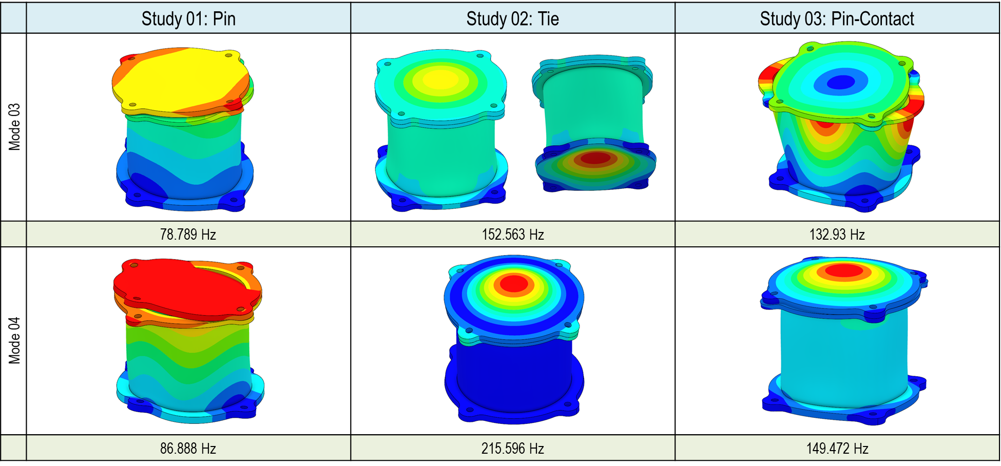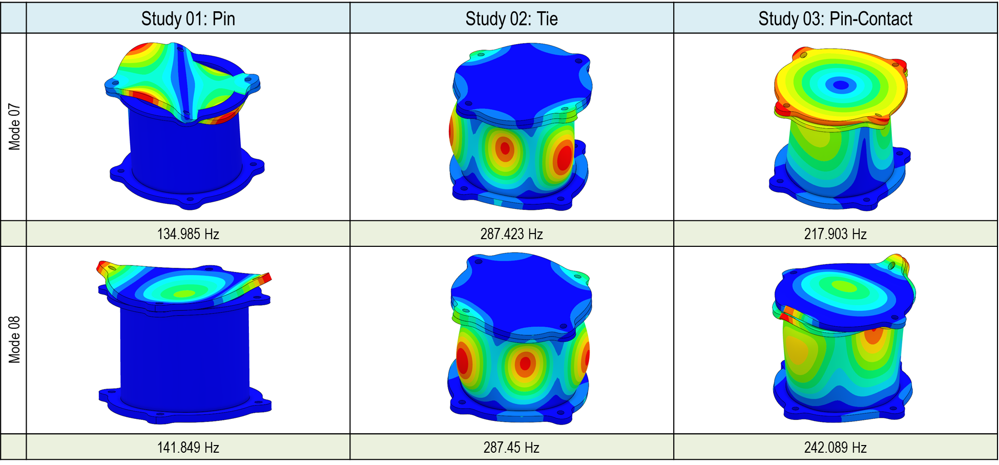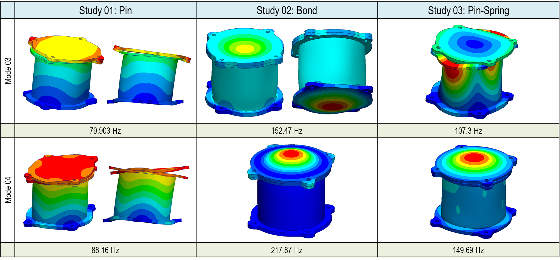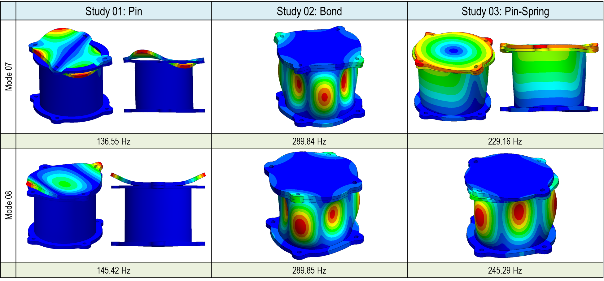 Bolt/Pin 커넥터를 사용할 때는 1차, 5차, 6차, 10차에 공유주파수 뿐만 아니라 고유형상 모드에도 차이가 있는 것을 확인할 수 있습니다. 본드 결합에서는 동일한 결과를 얻을 수 있었습니다만 접촉/스프링 결과에도 3차, 5차, 6차, 7차 등에 고유주파수의 차이가 있는 것을 확인 되었습니다. 해당 차이를 고유모드형상에도 확인됩니다. 본 기술 문서의 마지막 다음 편에는 결과에 차이가 왜 나는지 검증하도록 하겠습니다.