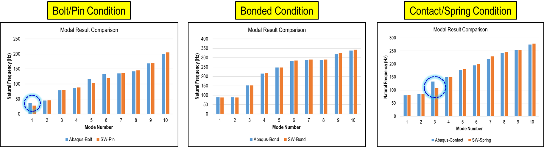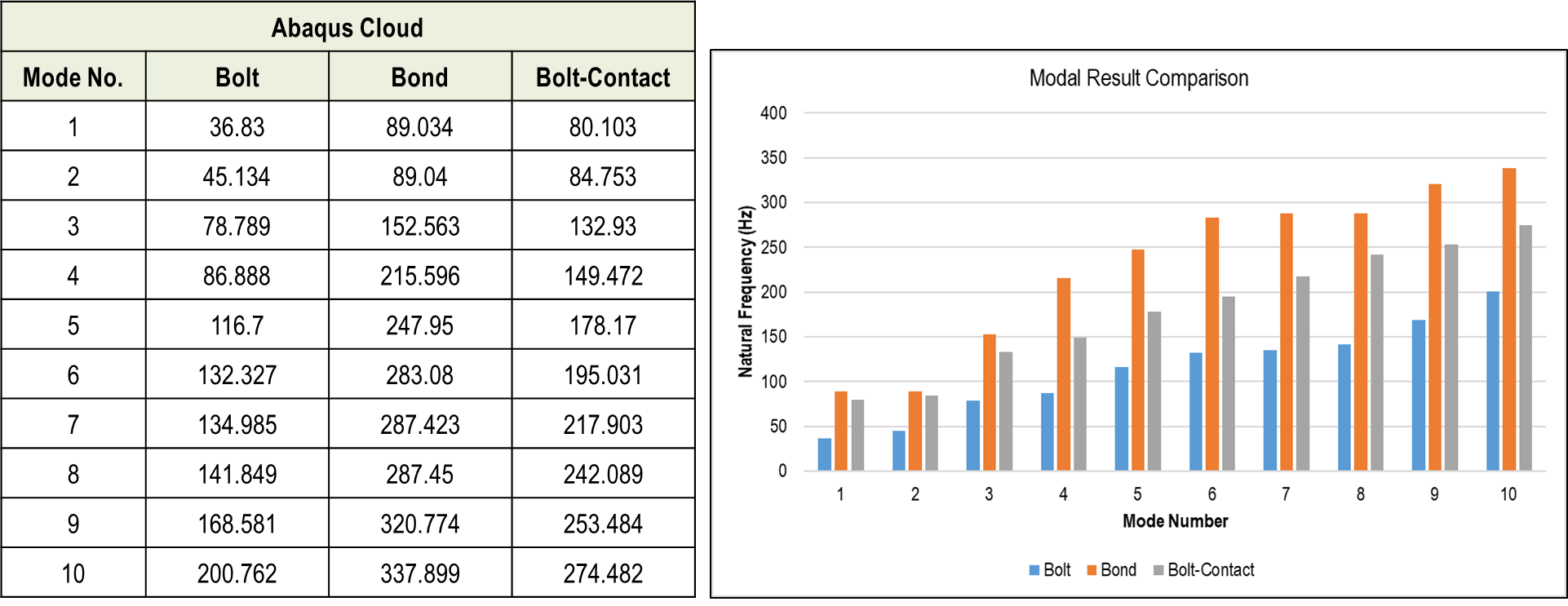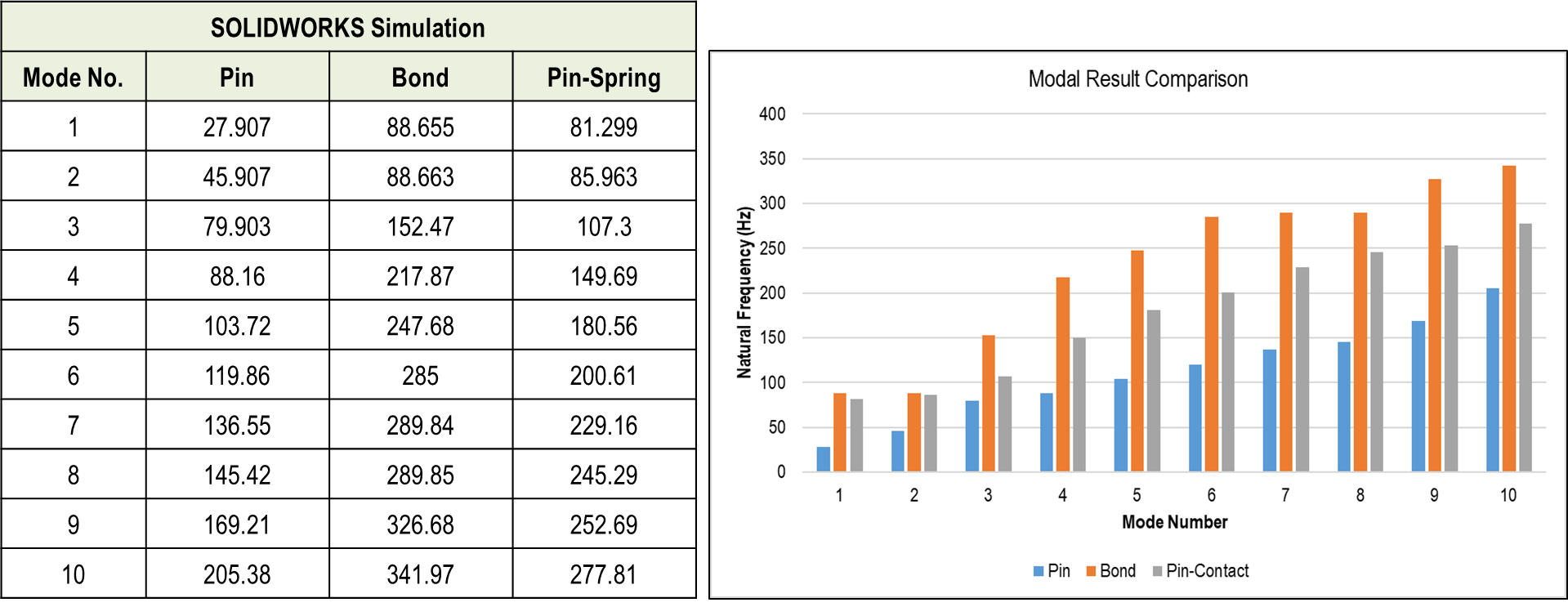 예상대로 본드 결합 결과에서는 고유주파수가 더 높게 나온 것을 확인 되었습니다. Abaqus 및 SW Simulation 결과를 아래와 같이 서로간의 결과를 차이를 확인할 수 있습니다.