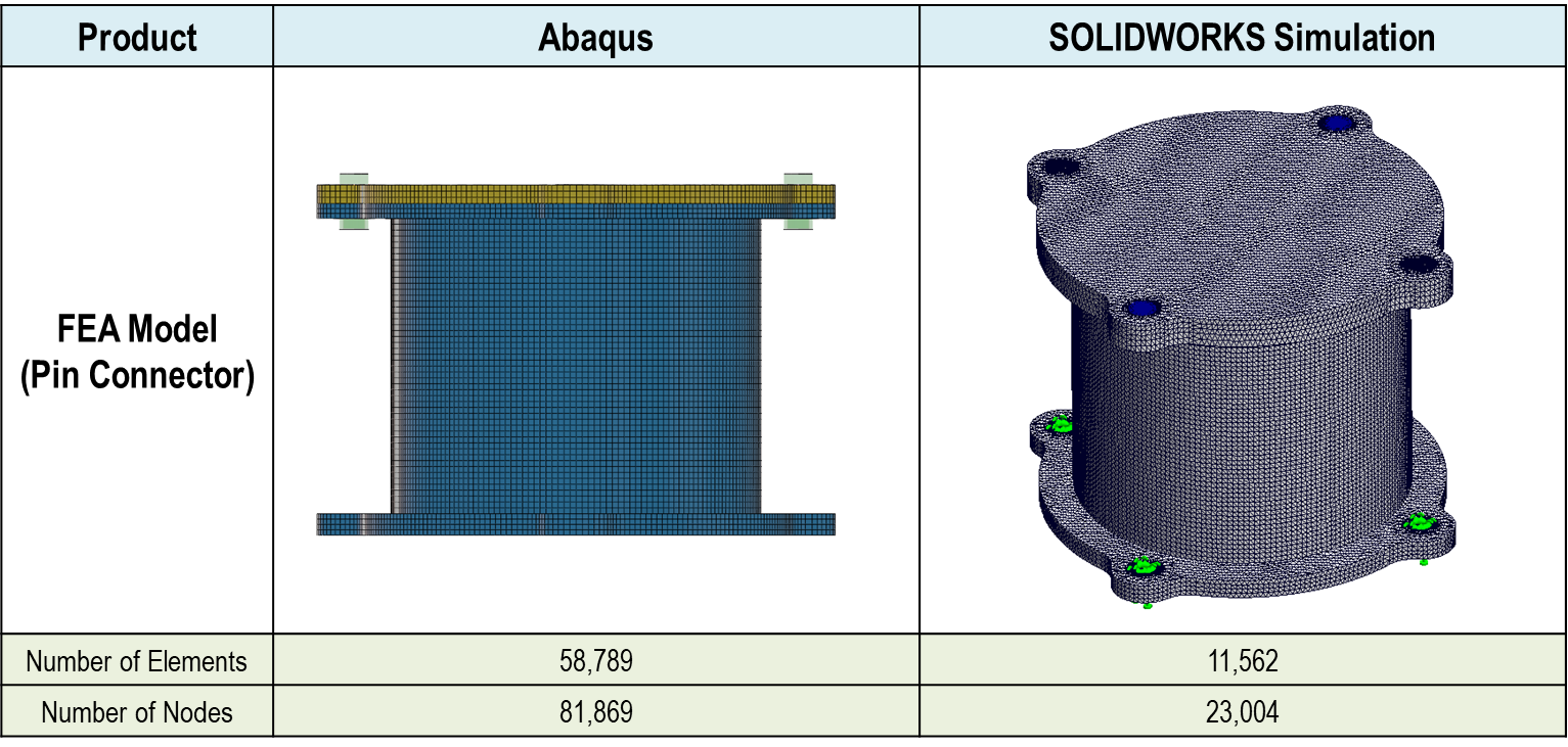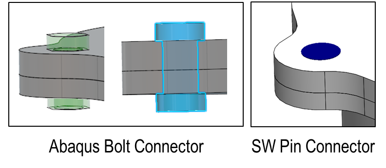 육면체 요소 같은 경우 같은 캐드 모델이지면 사면체 모델 대비 노드 개수가 매우 낮은 것을 확인되며 이것이 바로 육면체 (Hexa) 요소의 장점입니다. 부품간의 연결을 아래 그림과 같이 볼트 (Abaqus) 및 핀 (SW Simulation) 커넥터를 사용하여 FEA 모델이 준비됩니다.