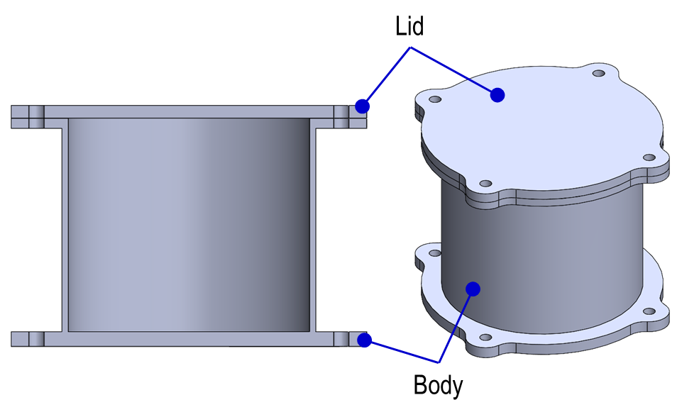 간단한 압력 용기의 구조 모델이며 아래 하단부에 있는 4개의 홀에 구속 조건 잡고 상기에는 4개의 위치에 뚜껑을 볼트/핀을 통해서 체결해줍니다. 모달 해석 결과를 잘 보이기 위해서 뚜껑을 2개의 볼트/핀을 통해서 체결하여 해석을 수행할 예정입니다. Abaqus에서는 볼트 커넥터 그리고 SW Simulation에서는 핀 커넥터를 통해서 구조를 체결합니다.