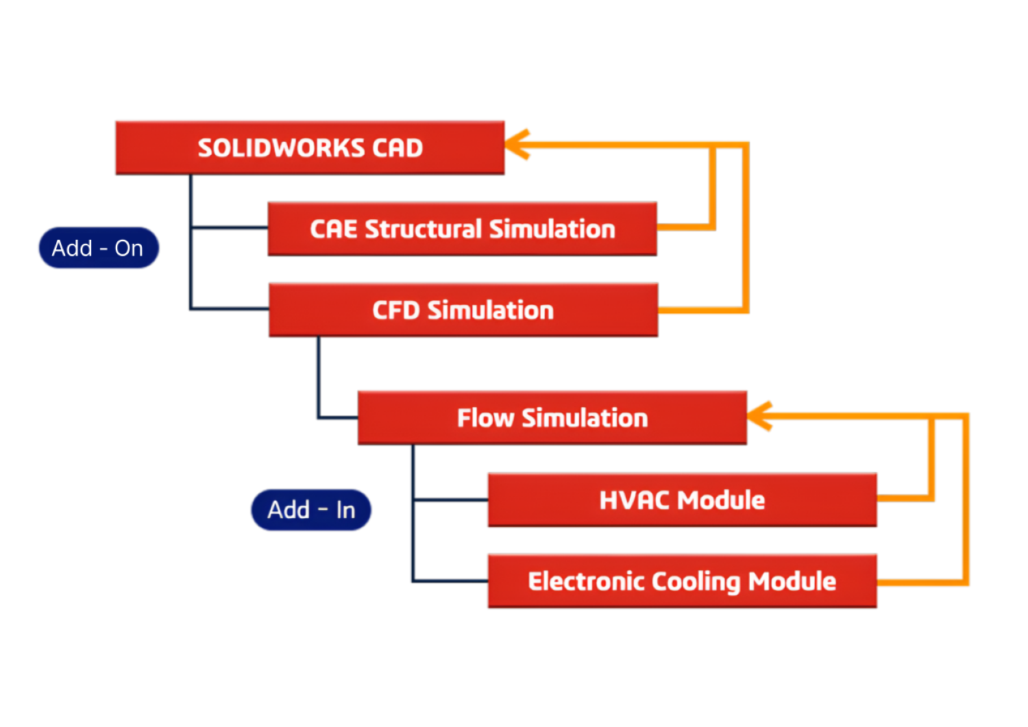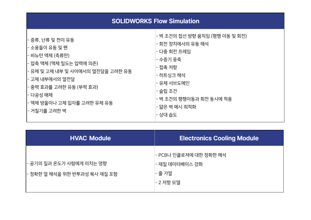 모든 해석 제품은 SOLIDWORKS CAD에서 Add-in 방식으로 실행되며, Flow Simulation 기반으로 모듈을 선택해 나만의 해석 환경을 완성하세요!